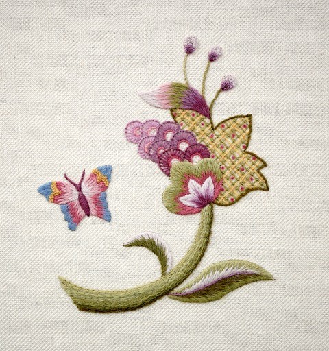 Workshop Information: This embroidery project draws inspiration from the 4-panelled crewelwork screen held in the Royal School of Needlework collection. It features a beautifully stylised flower with a delicate butterfly hovering nearby. The design is worked on linen twill fabric using Appleton’s crewel wools, employing a variety of stitches including long and short stitch, trellis stitch, raised stem stitch, stem stitch, closed fly, French knots, and bullion knots. This is a lovely project for crewelwork enthusiasts!