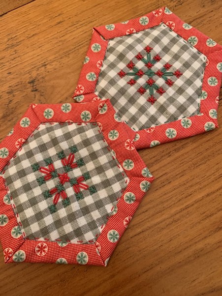 Carolyn Forster: Chicken Scratch Embroidery Hexagon Coasters, Quilt As You Go (Hand Stitching) – £15