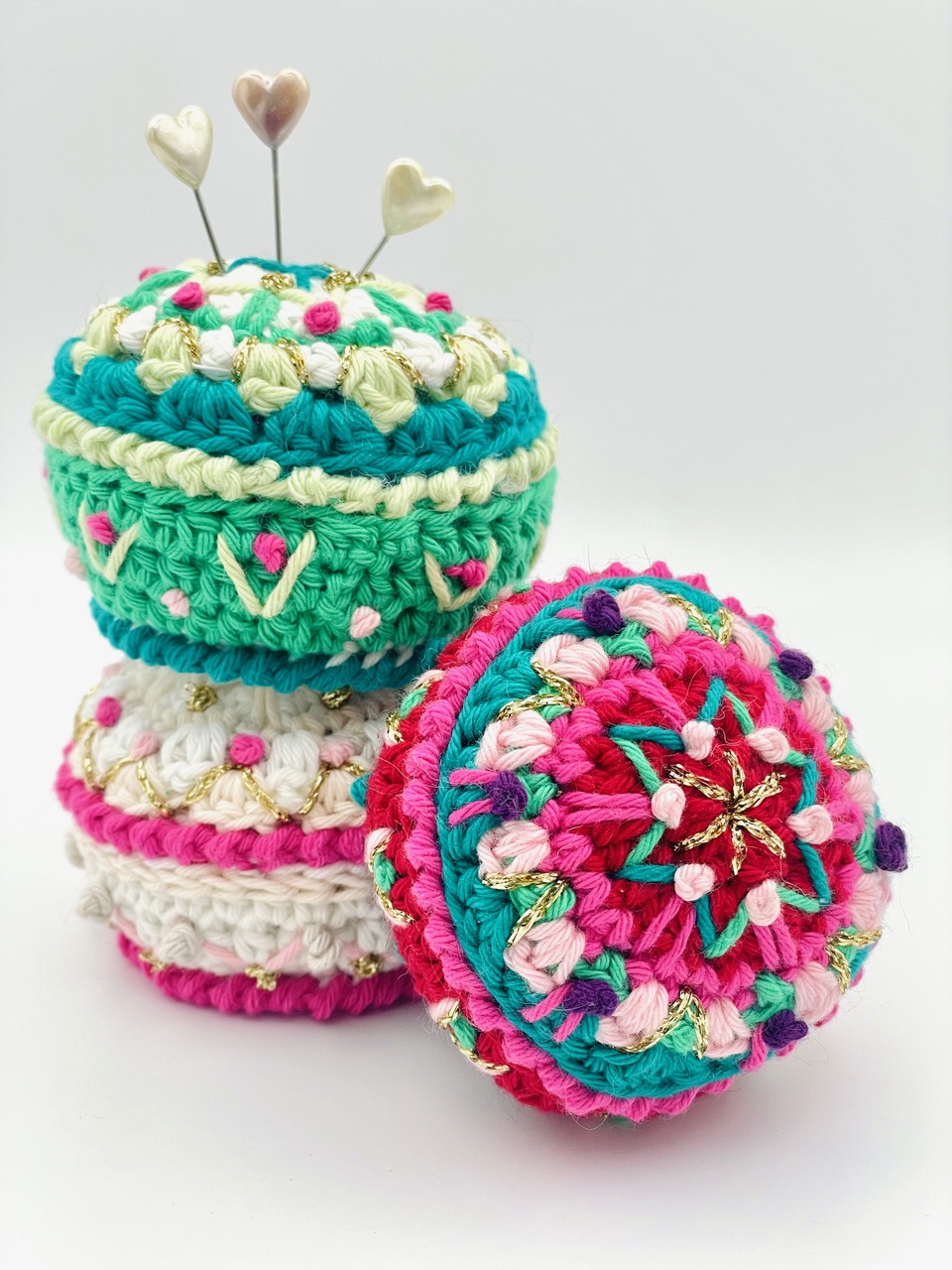 The course begins with crocheting in the round to create the pin cushion base and sides. This will include learning to make a seamless invisible join together with a crab stitch border for the base. You will continue to make the pin cushion top working in the round using a variety of crochet stitches and changing colour every round. Once the crochet is completed, the real fun begins, as we play with creating different textures and finishes using a variety of simple embroidery stitches and techniques to embellish the pin cushion top and sides before joining and stuffing the finished piece. The joy of this project is there are no ends to sew in as they remain hidden within the cushion – hurrah!