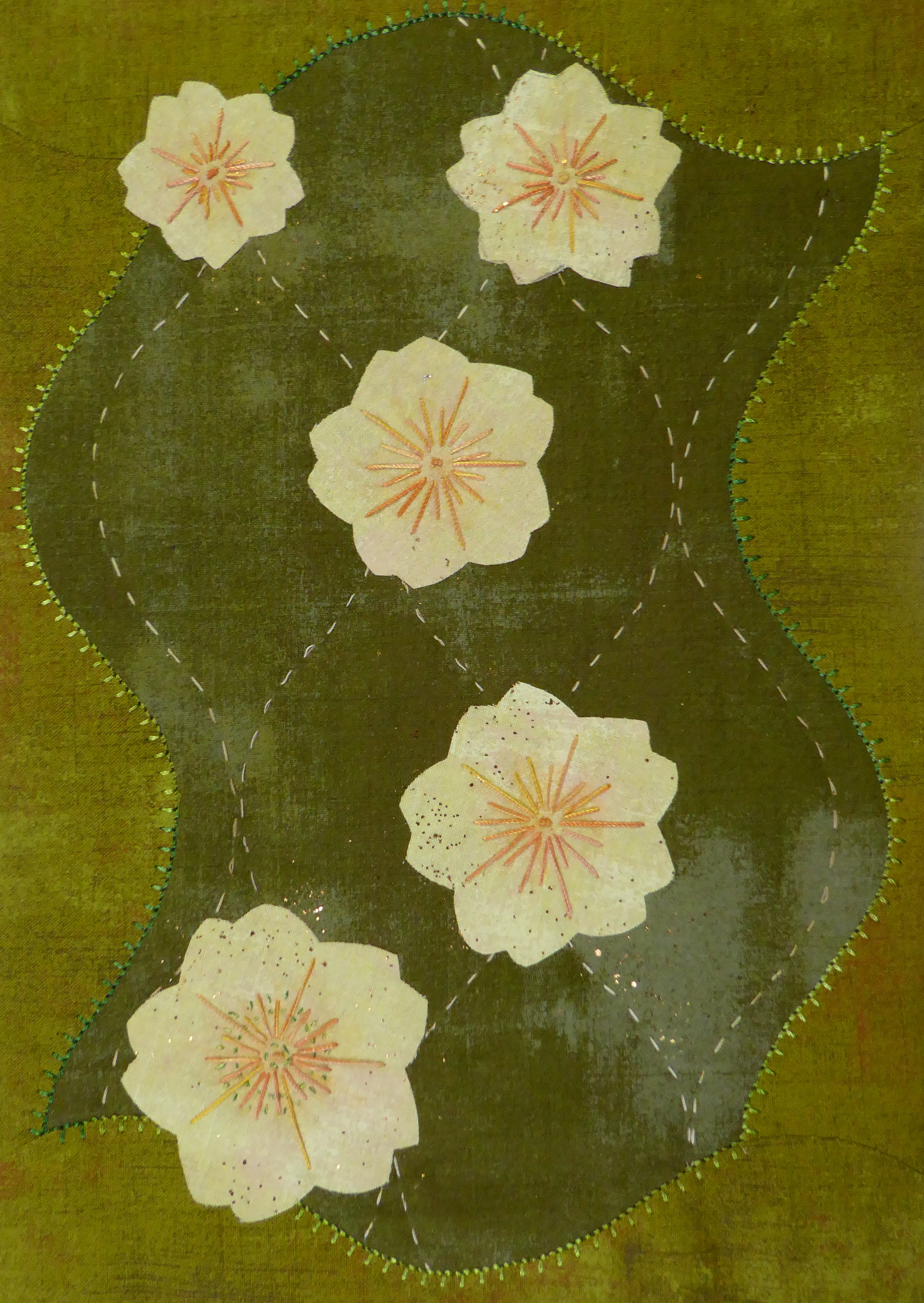 Work with Pat’s oriental templates to create a delightful cherry blossom design, accented with gently curving waves of Japanese quilting. The workshop will cover Bondaweb appliqué, sashiko style stitching, gilding and foiling, and how to add beautiful wavy borders to enhance your designs. These templates are sure to transform your work!